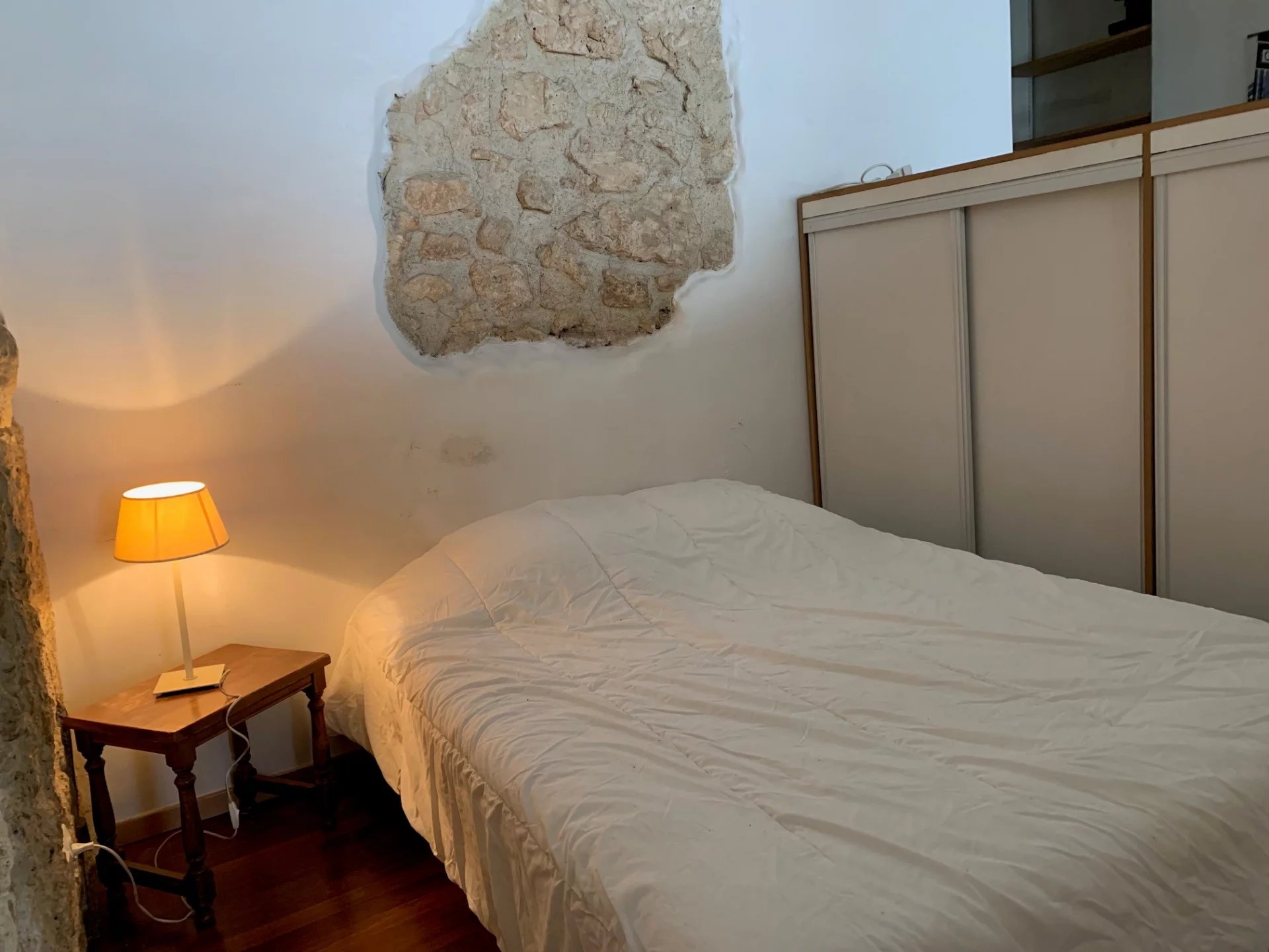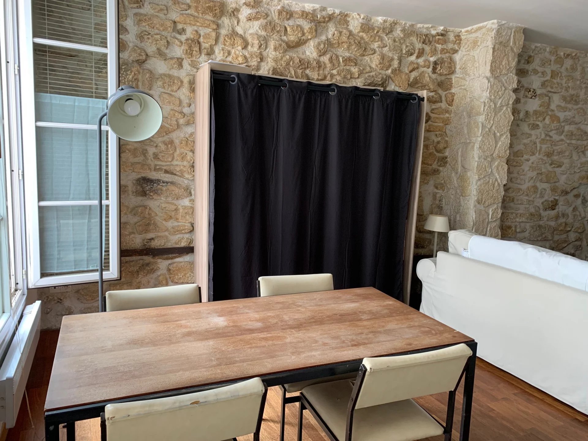 Grand studio MEUBLÉ de 39,25 m² a 2 pas des Halles. Dans un immeuble ancien au 3ème étage sans ascenseur, appartement composé d'une entrée, d'une grande pièce principale avec coin chambre, une cuisine ouverte équipée et d'une salle de douche avec WC.
